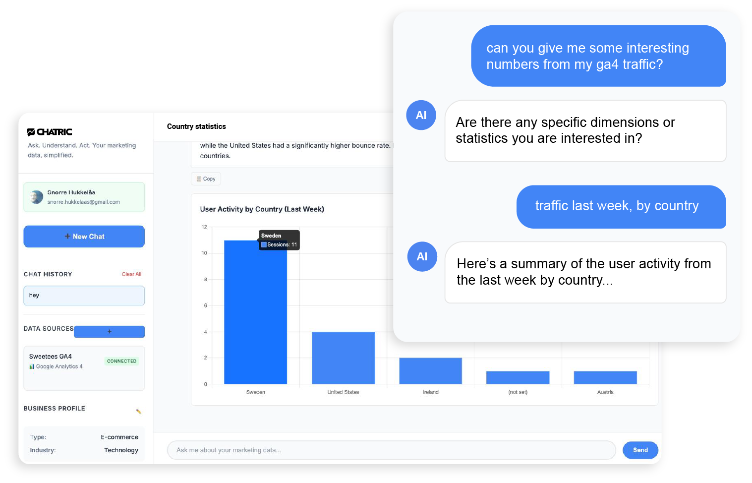Connect GA4, Google Ads, Meta, Shopify, and more – Chatric combines your data to give you answers that actually matter.